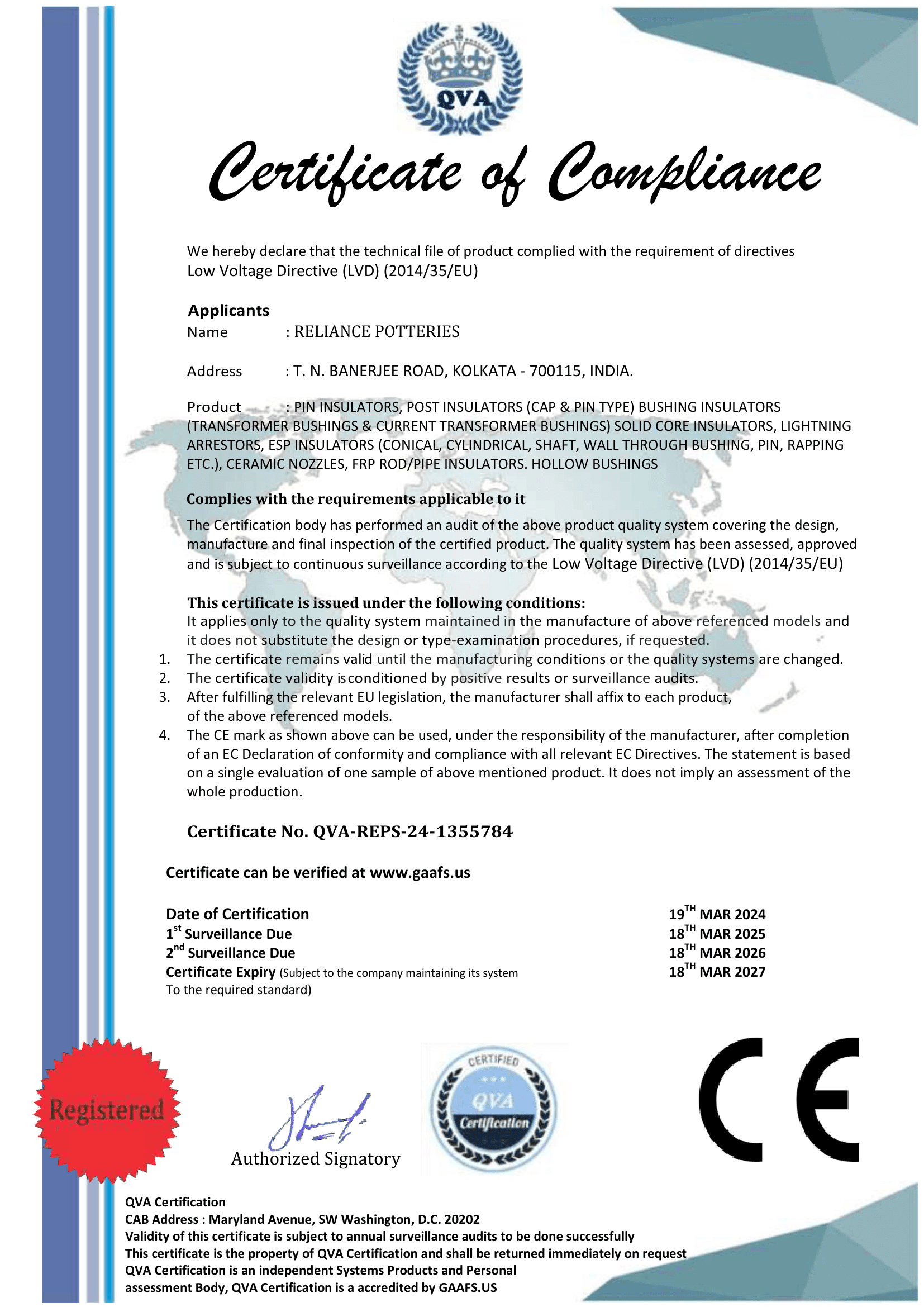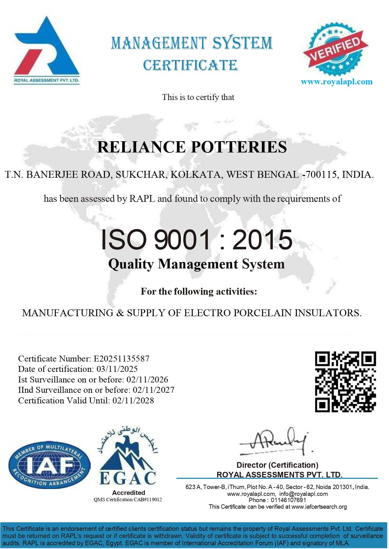 Reliance Potteries insulators conform to global quality and safety standards, including IS, BS, IEC, DIN, ANSI.